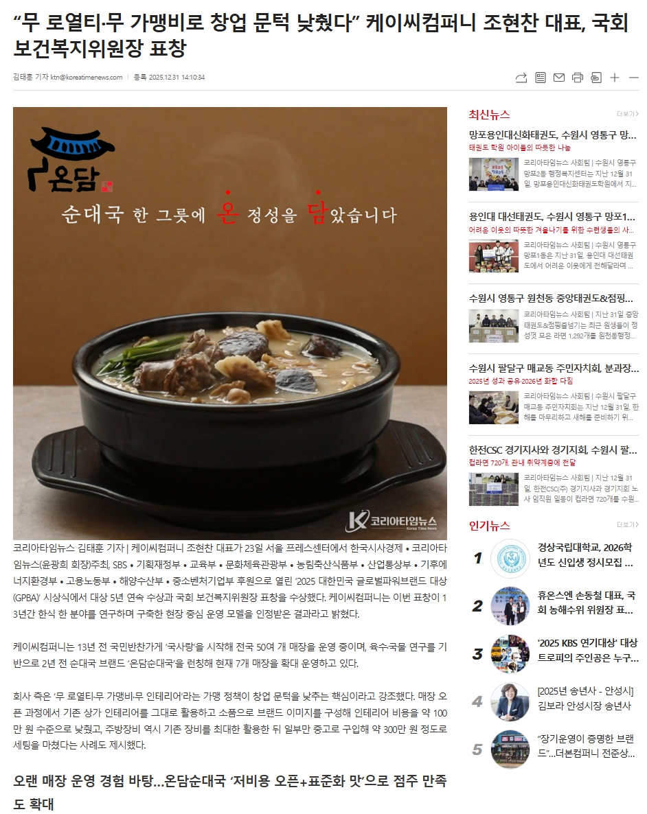 코리아타임뉴스 김태훈 기자 | 온담순대국을 운영하는 한식 전문 기업 케이씨컴퍼니에서